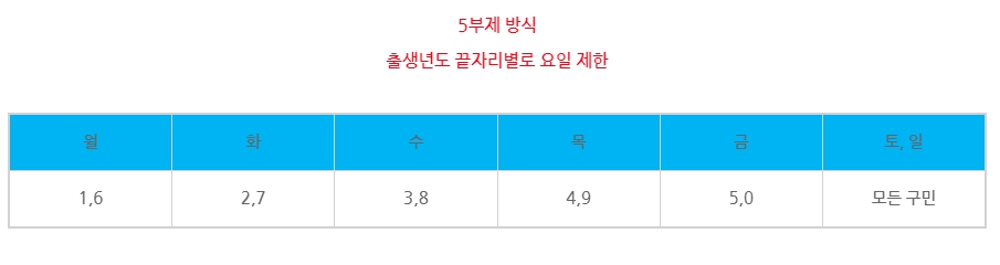 - 5부제 방식으로 진행이되며 출생연도 끝자리별로 요일 제한 신청